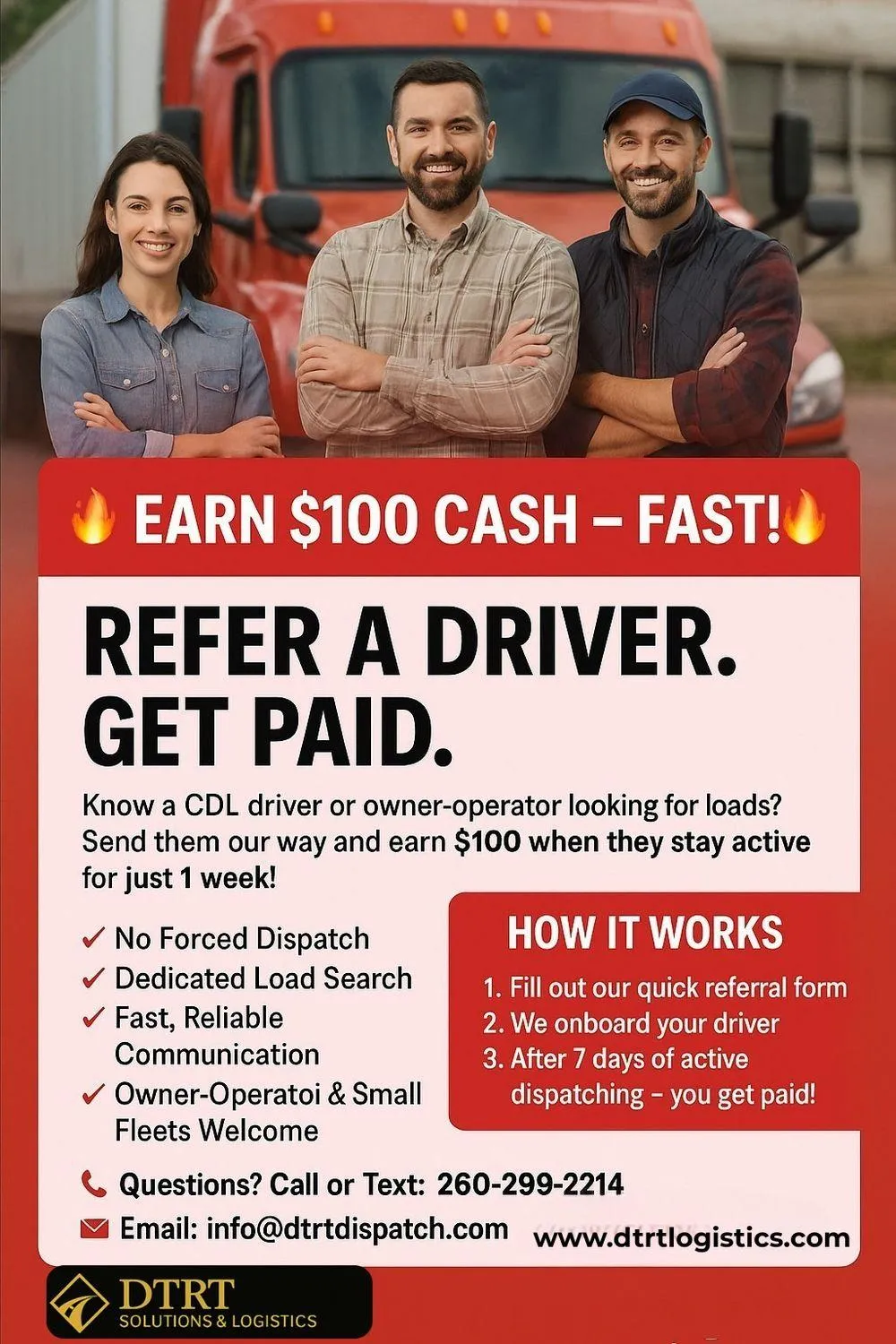 The referred driver must remain active for at least 7 days with DTRT Solutions & Logistics to qualify.